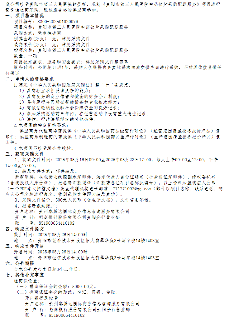 【贵阳市第三人民医院】贵州省贵阳市第三人民医院中药饮片采购配送服务采购公告