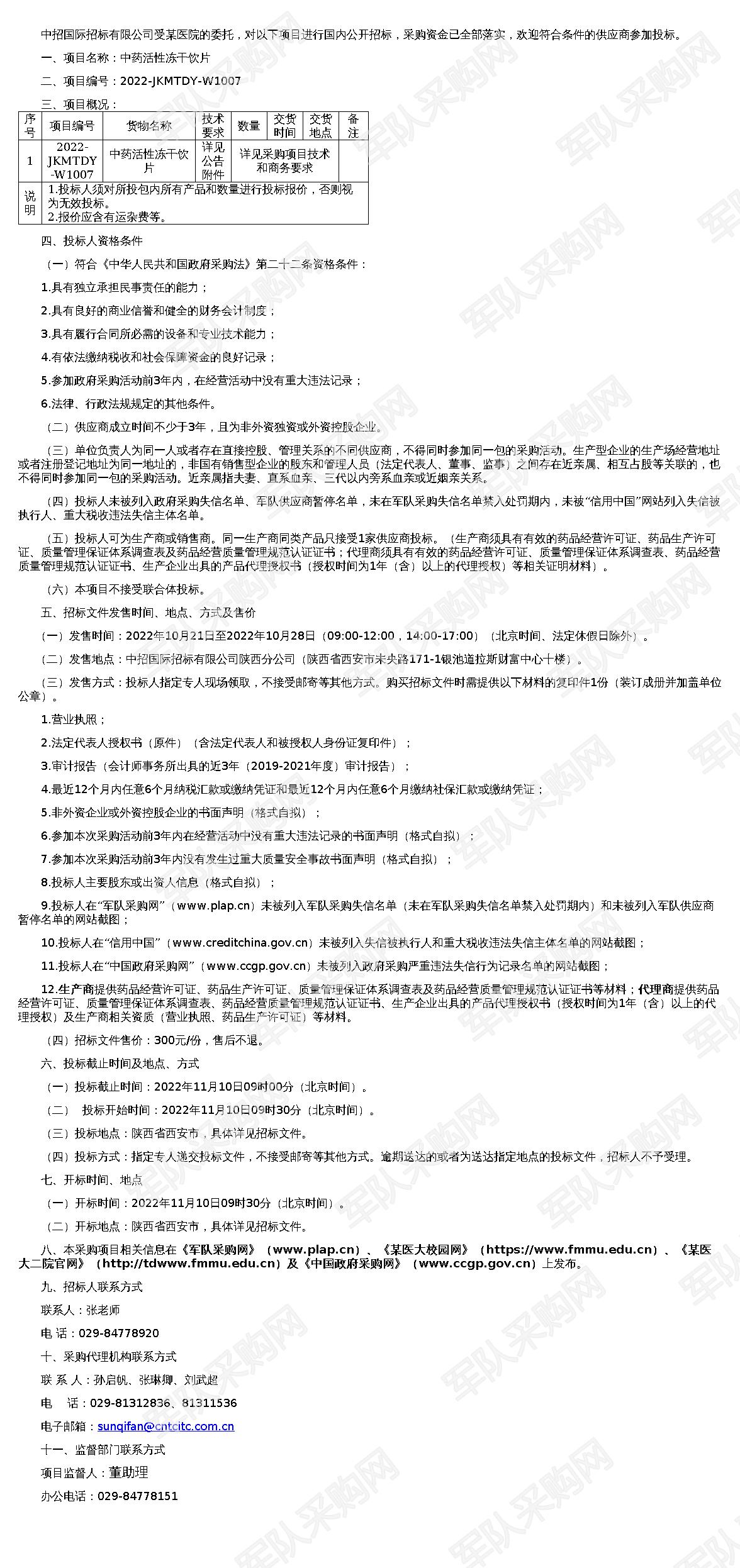 【军队采购网】中药活性冻干饮片招标公告(2022-JKMTDY-W1007)(20221021)