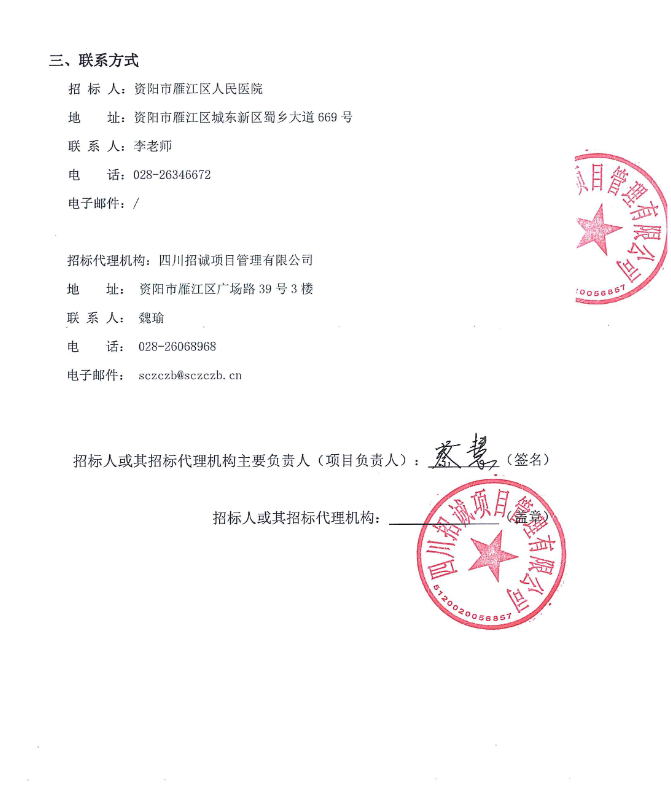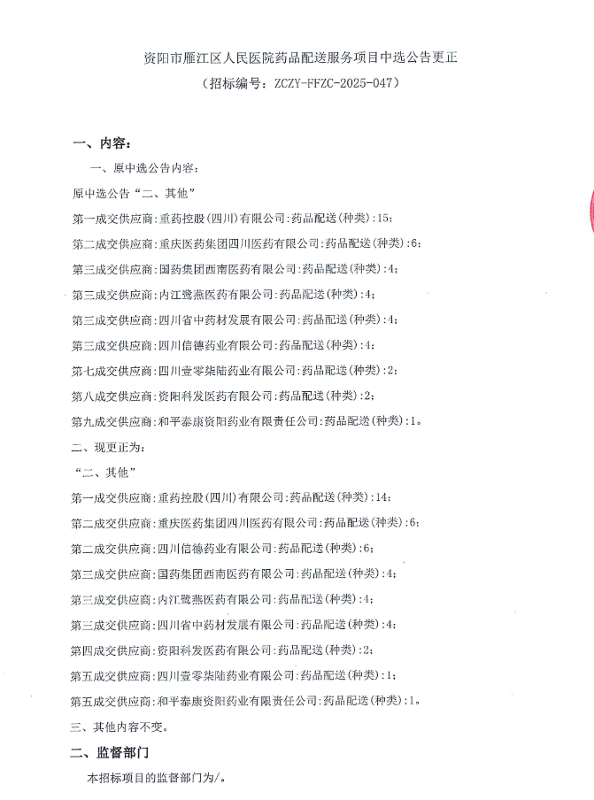 【资阳市雁江区人民医院】四川省资阳市雁江区人民医院药品配送服务项目中选公告更正