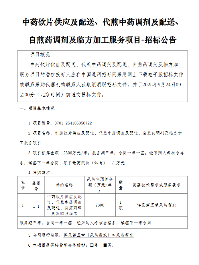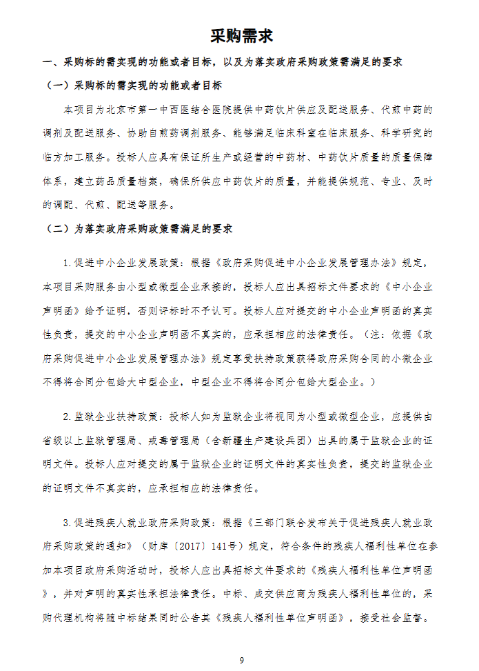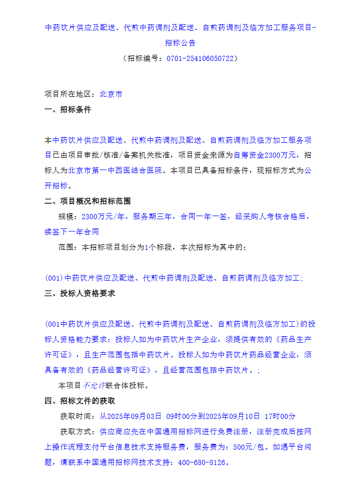 【北京市第一中西医结合医院】北京市第一中西医结合医院中药饮片供应及配送、代煎中药调剂及配送、自煎药调剂及临方加工服务项目-招标公告