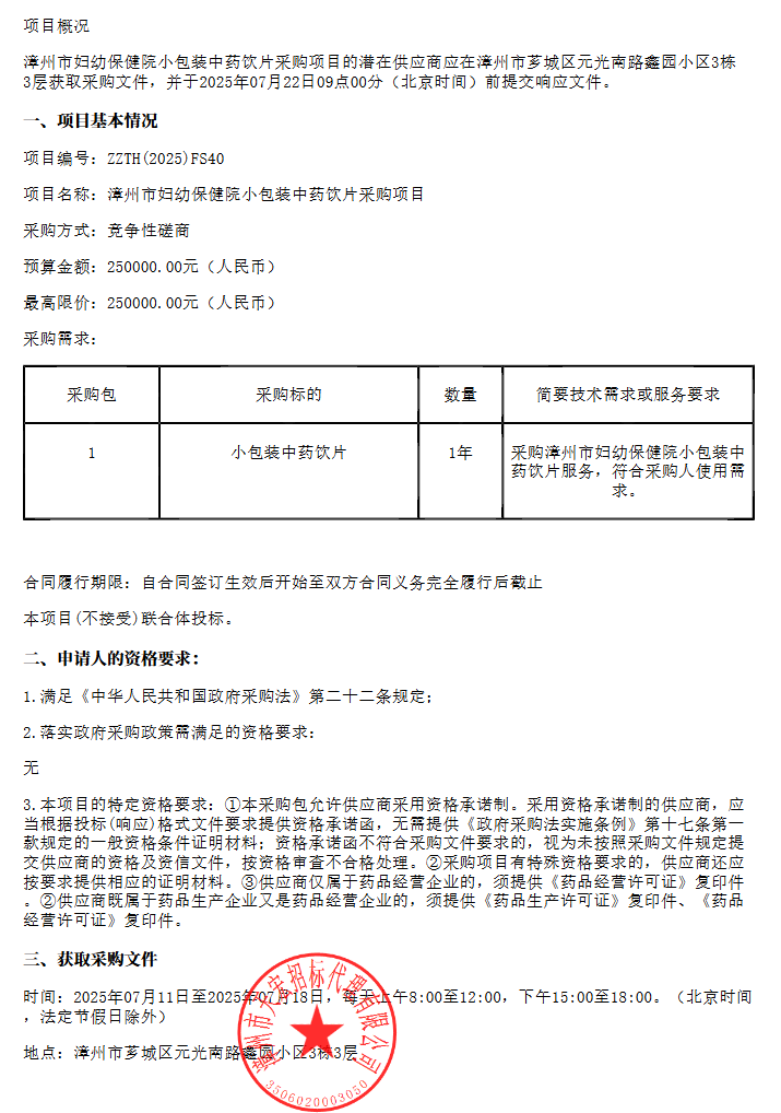 【漳州市妇幼保健院】福建省漳州市妇幼保健院小包装中药饮片采购项目竞争性磋商公告