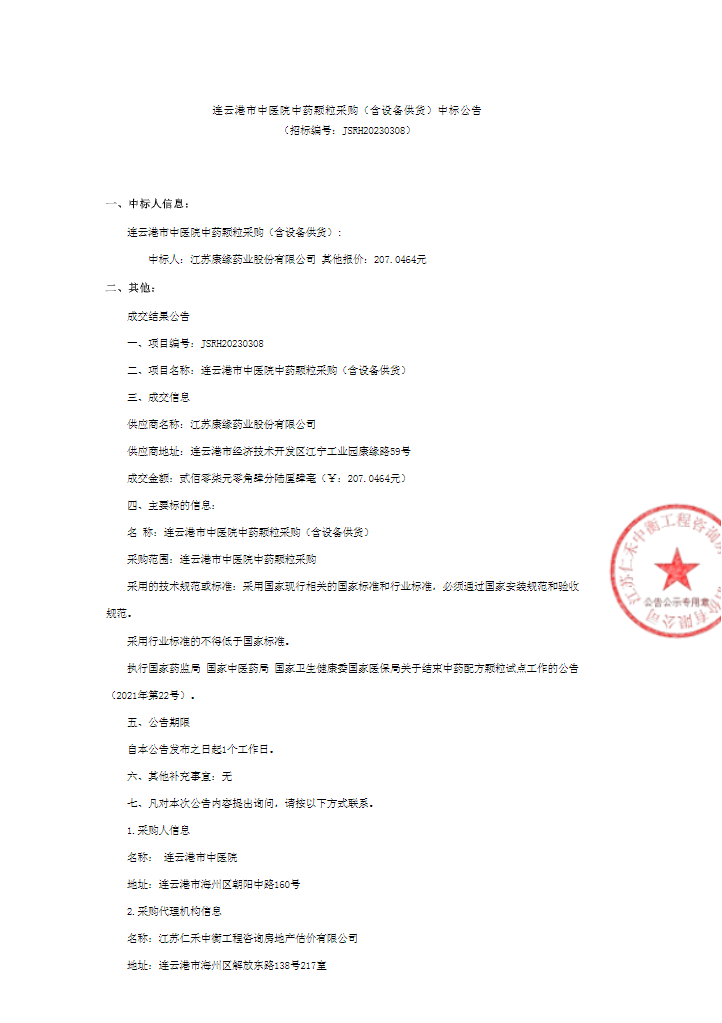 【连云港市中医院】江苏省连云港市中医院中药颗粒采购(含设备供货)中标公告