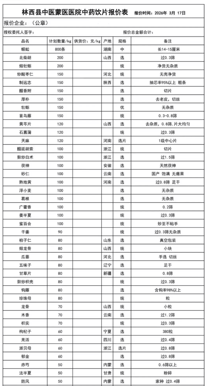 2、填好报价后打印出来盖好企业公章,授权委托人签字,邮寄到我单位。(邮寄地址:赤峰市林西县中蒙医院药剂科 收件人:鞠亚东 电话:15149070001)