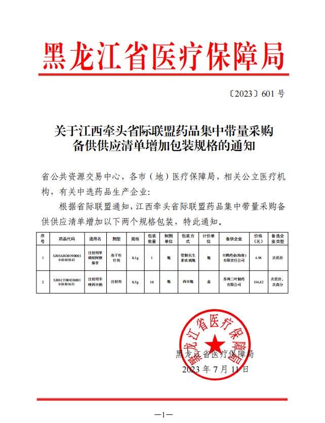 【黑龙江】关于江西牵头省际联盟药品集中带量采购备供供应清单增加包装规格的通知