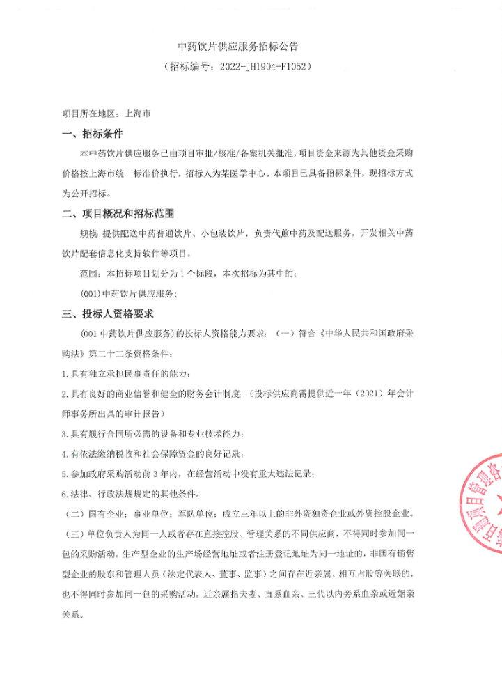 【上海市某医学中心】上海市某医学中心中药饮片供应服务招标公告