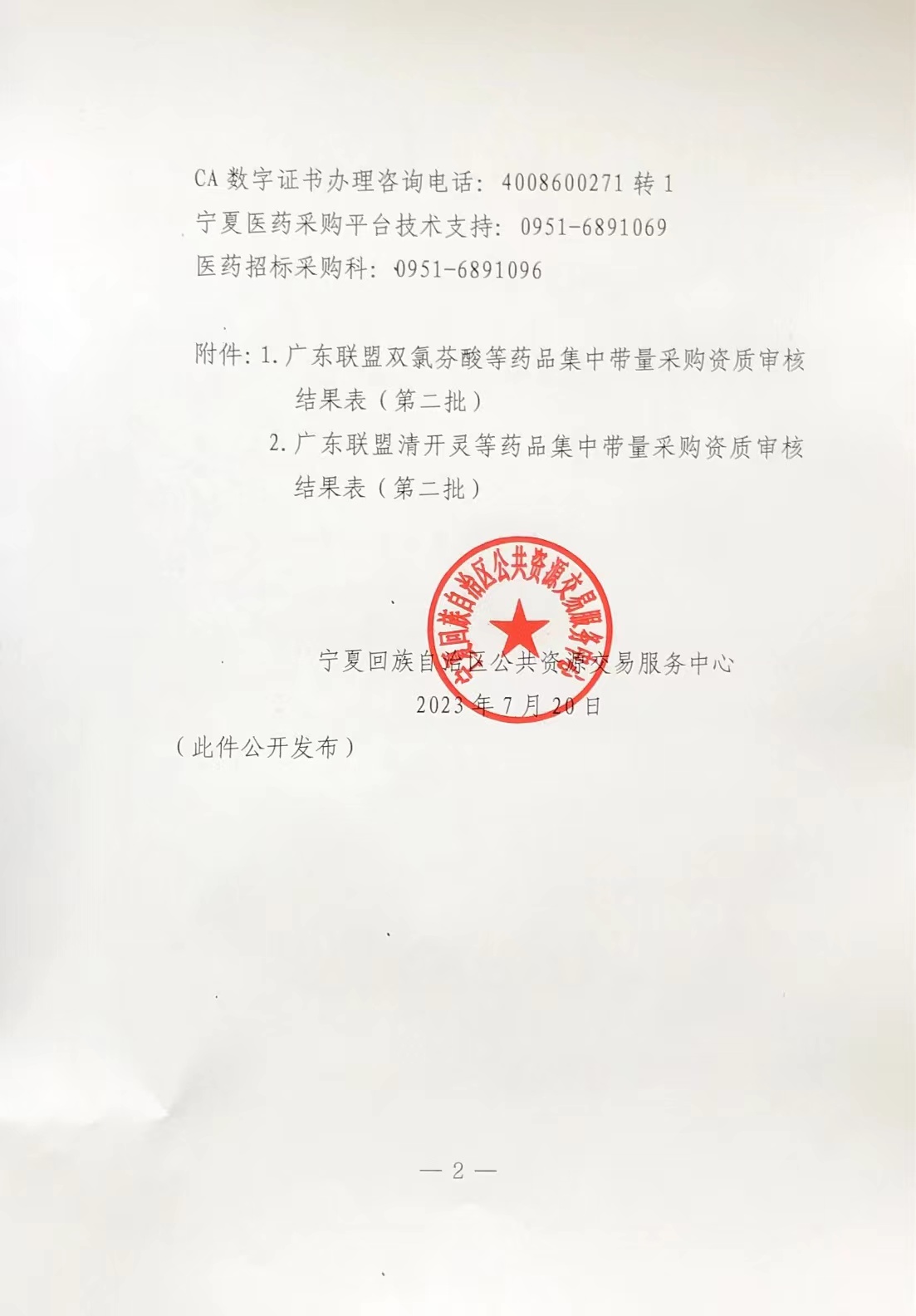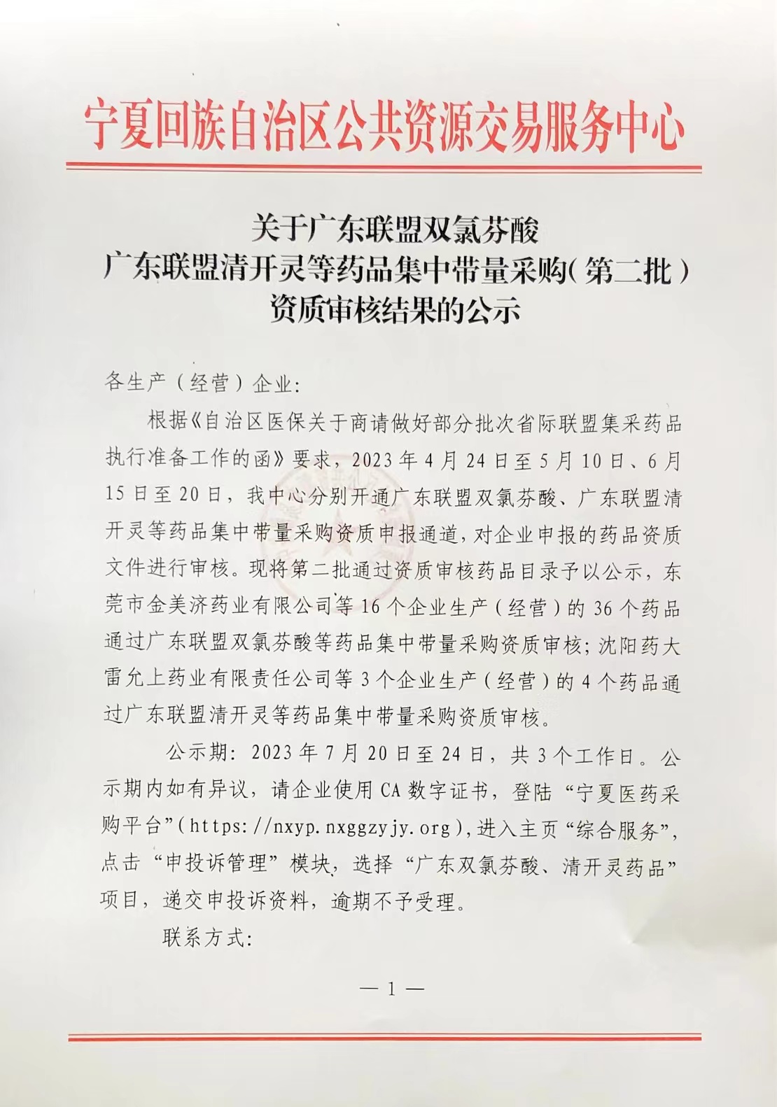 公示期:2023年7月20日至24日,共3个工作日。公示期内如有异议,请企业使用CA数字证书,登陆“宁夏医药采购平台”(https://nxyp.nxggzyjy.org),进入主页“综合服务”,点击“申投诉管理”模块,选择“广东双氯芬酸、清开灵药品”项目,递交申投诉资料,逾期不予受理。