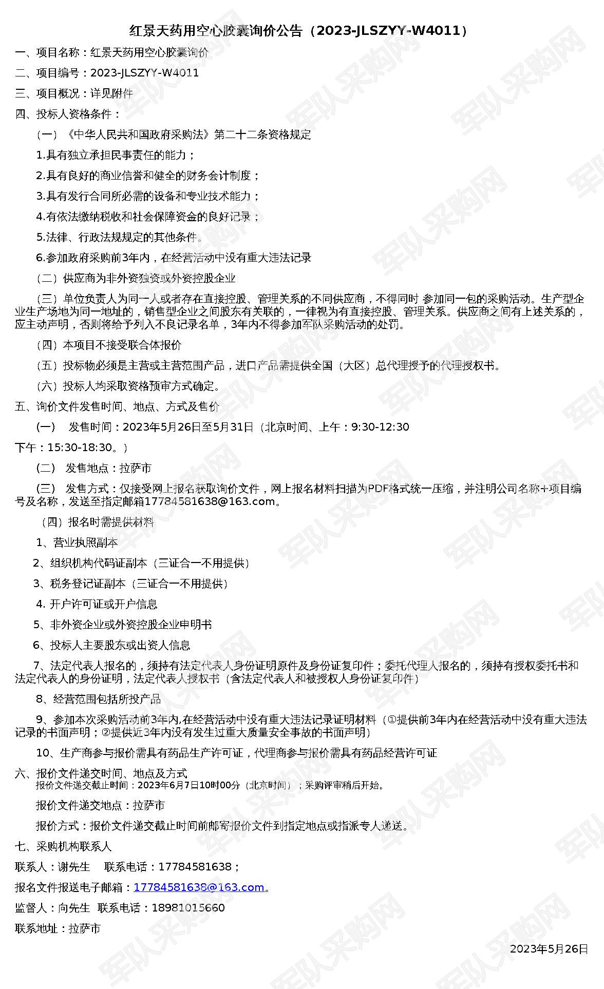 【军队采购】军队采购网红景天药用空心胶囊询价公告(2023-JLSZYY-W4011)