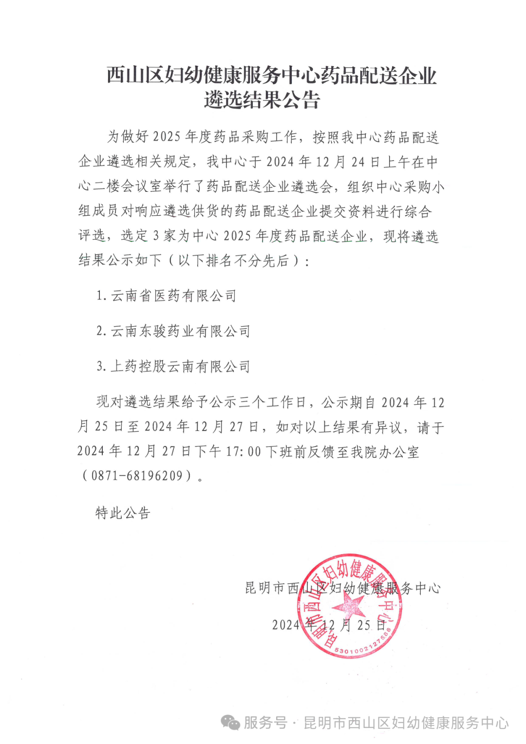 【昆明市西山区妇幼健康服务中心】云南省昆明市西山区妇幼健康服务中心药品配送企业遴选结果公告