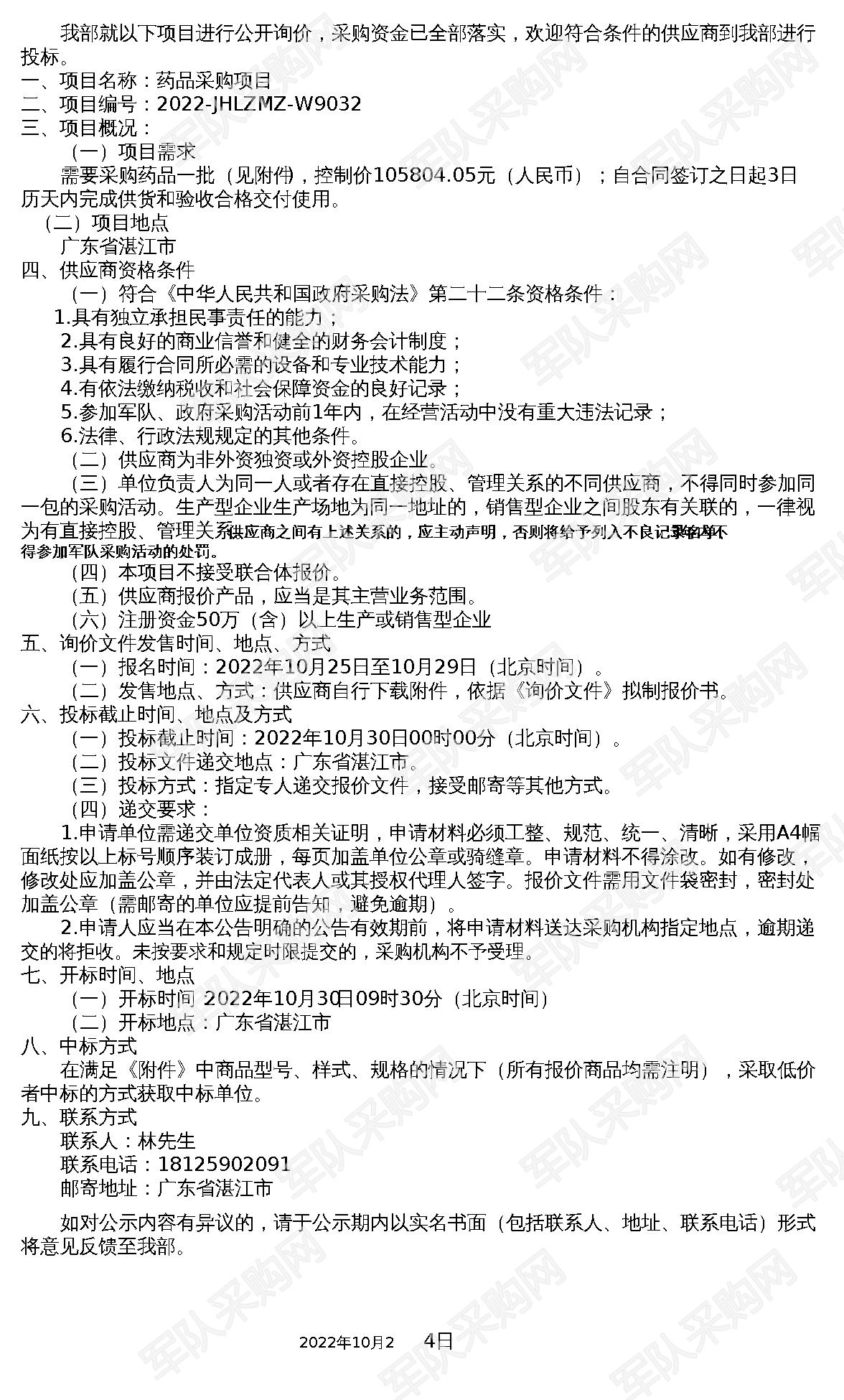 【军队采购网】药品采购公告(2022-JHLZMZ-W9032)