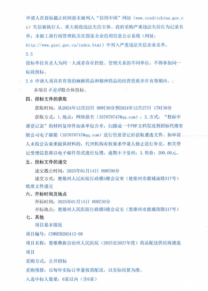 【楚雄彝族自治州人民医院】云南省楚雄彝族自治州人民医院(2025至2027年度)药品配送供应商遴选项目