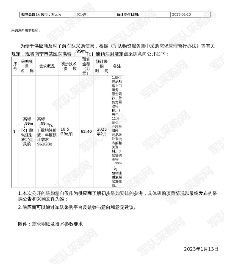 【军队采购】军队采购网南宁市某医院高锝[99mTc]酸钠注射液定点采购意向公开