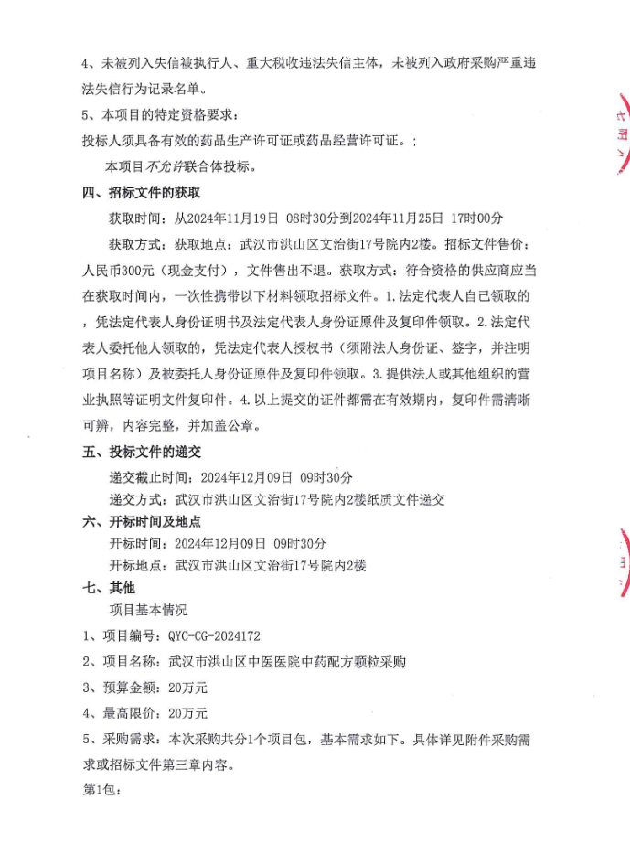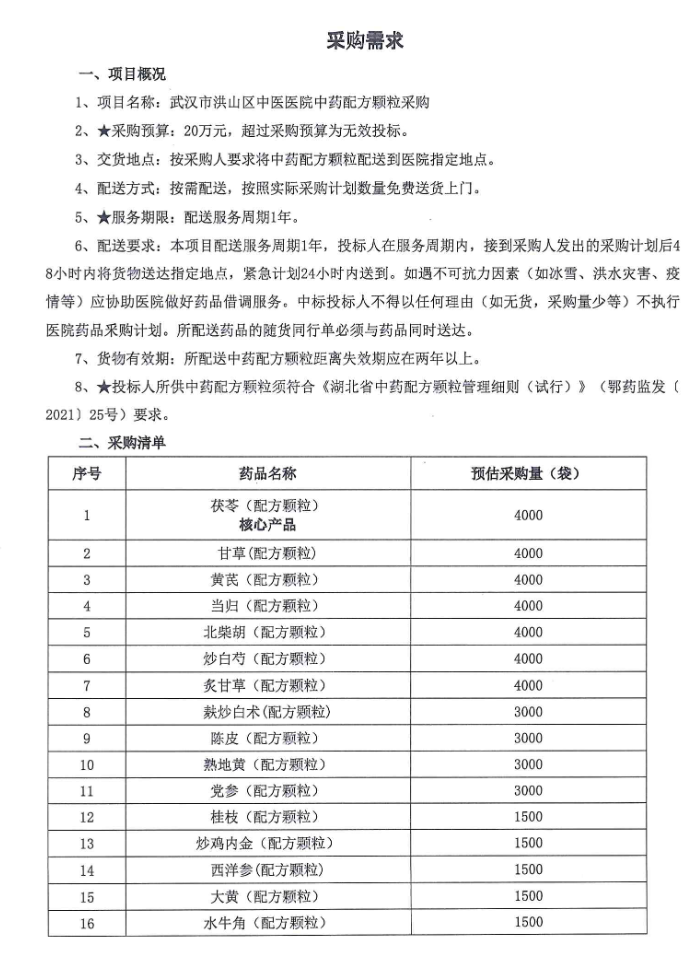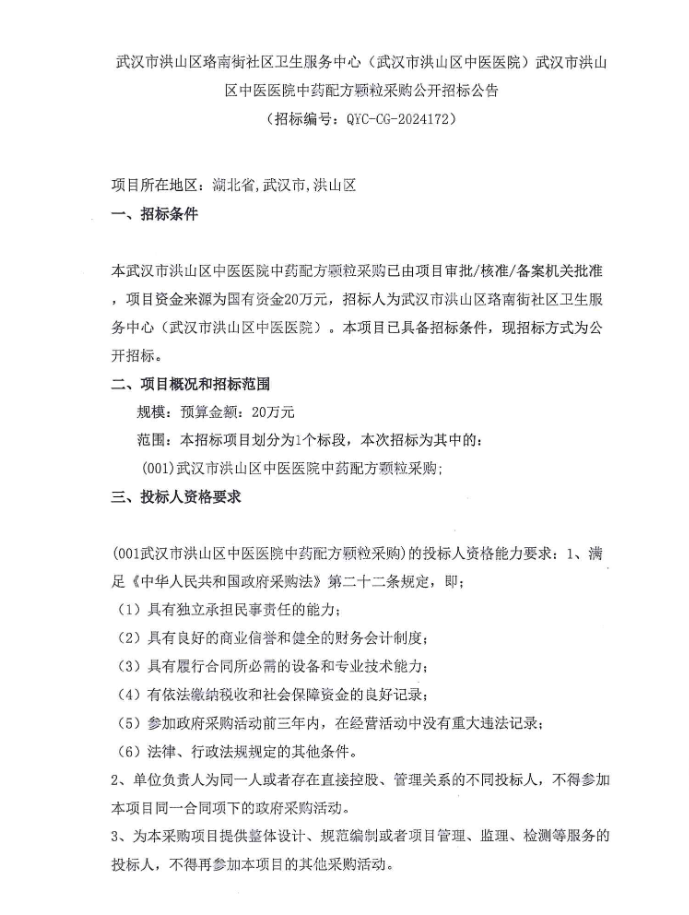 【武汉市洪山区珞南街社区卫生服务中心】湖北省武汉市洪山区珞南街社区卫生服务中心(武汉市洪山区中医医院)武汉市洪山区中医医院中药配方颗粒采购公开招标公告(20241118)