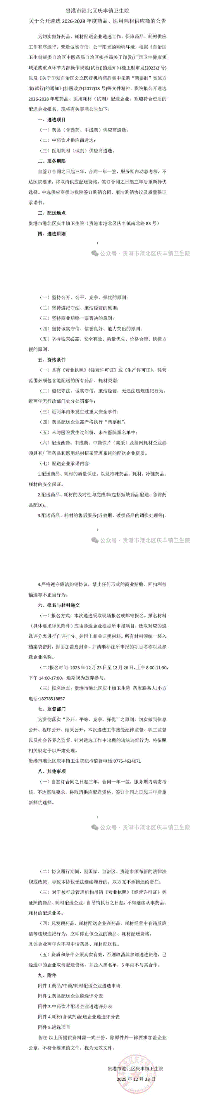 【贵港市港北区庆丰镇卫生院】广西壮族自治区贵港市港北区庆丰镇卫生院关于公开遴选2026-2028年度药品、医用耗材供应商的公告