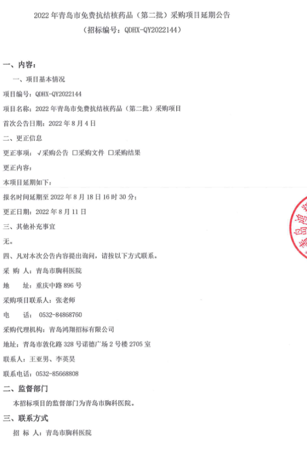 【青岛市胸科医院】2022年青岛市免费抗结核药品(第二批)采购延期公告