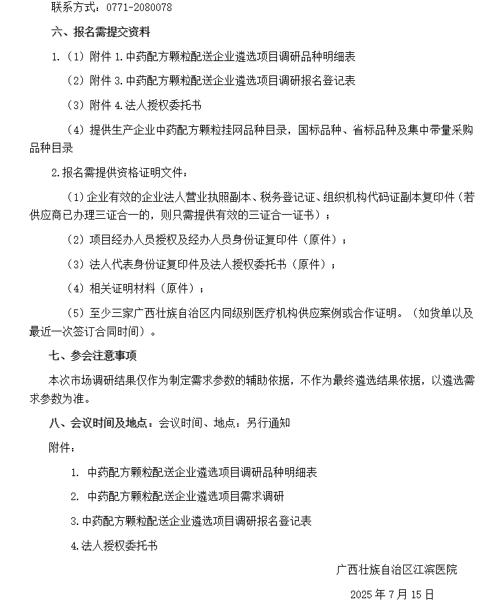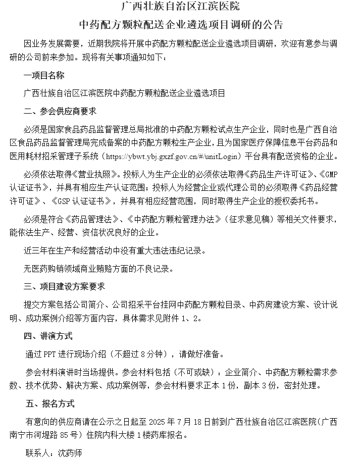 【广西壮族自治区江滨医院】广西壮族自治区江滨医院中药配方颗粒配送企业遴选项目调研的公告