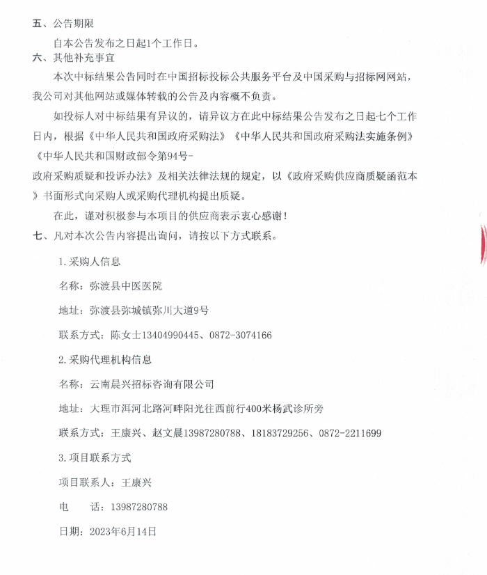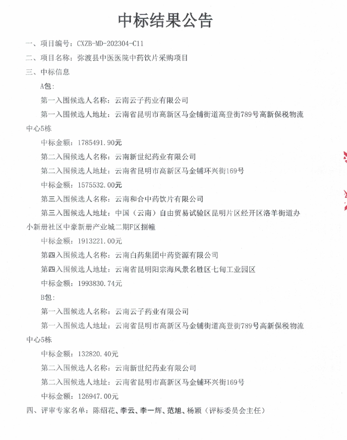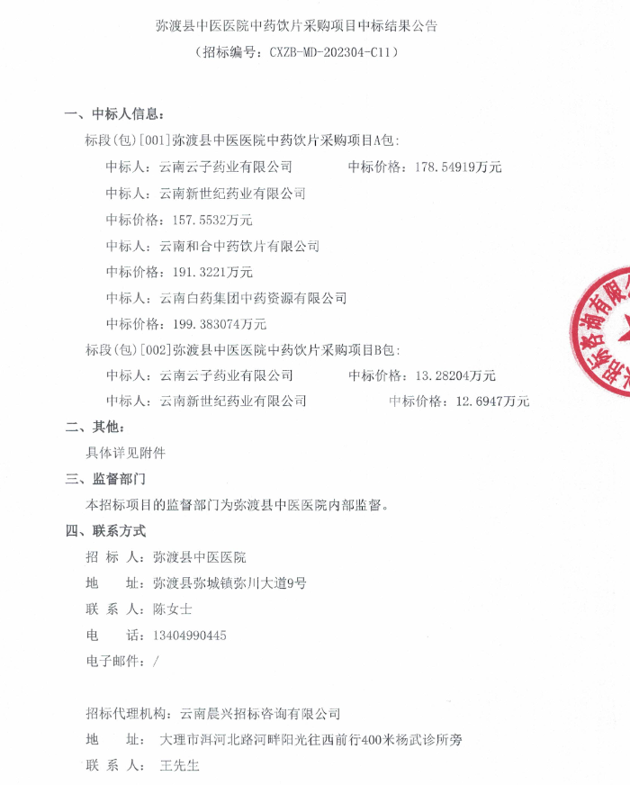 【大理白族自治州弥渡县中医医院】云南省大理白族自治州弥渡县中医医院中药饮片采购项目中标结果公告