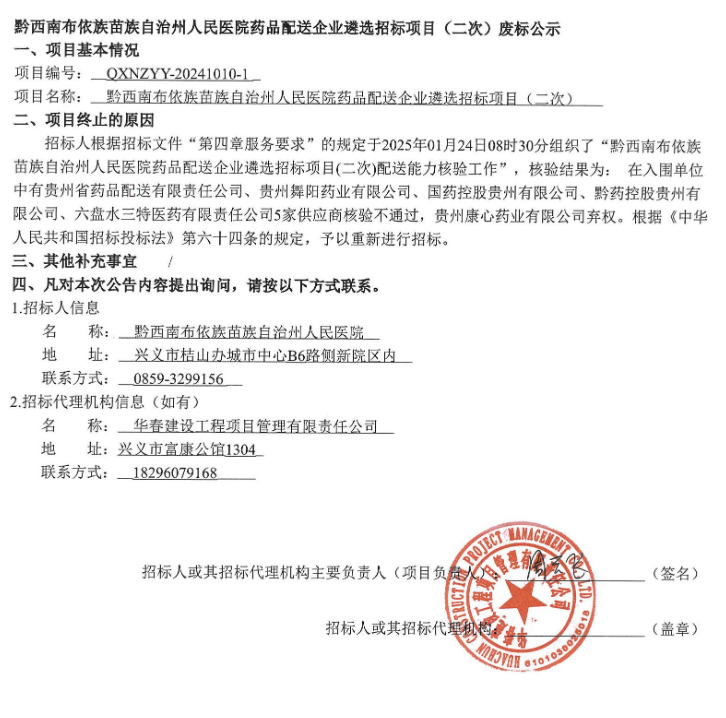 【黔西南布依族苗族自治州人民医院】贵州省黔西南布依族苗族自治州人民医院药品配送企业遴选招标项目(二次)