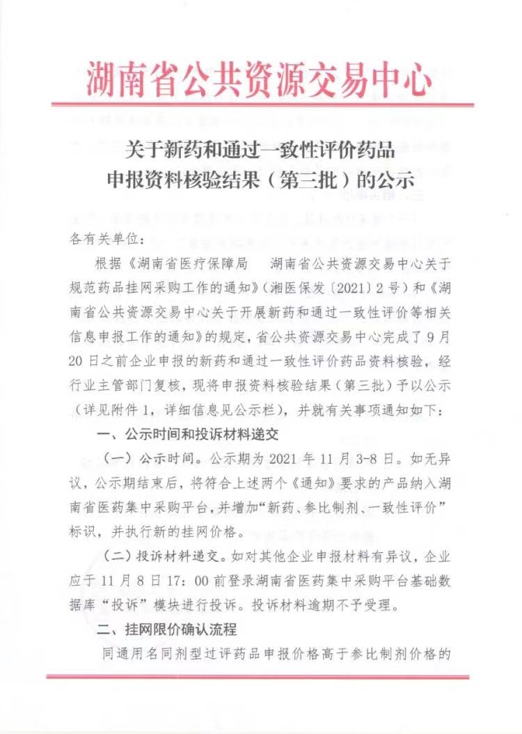 【湖南】2021年湖南省关于新药和通过一致性评价药品申报资料核验结果(第三批)的公示