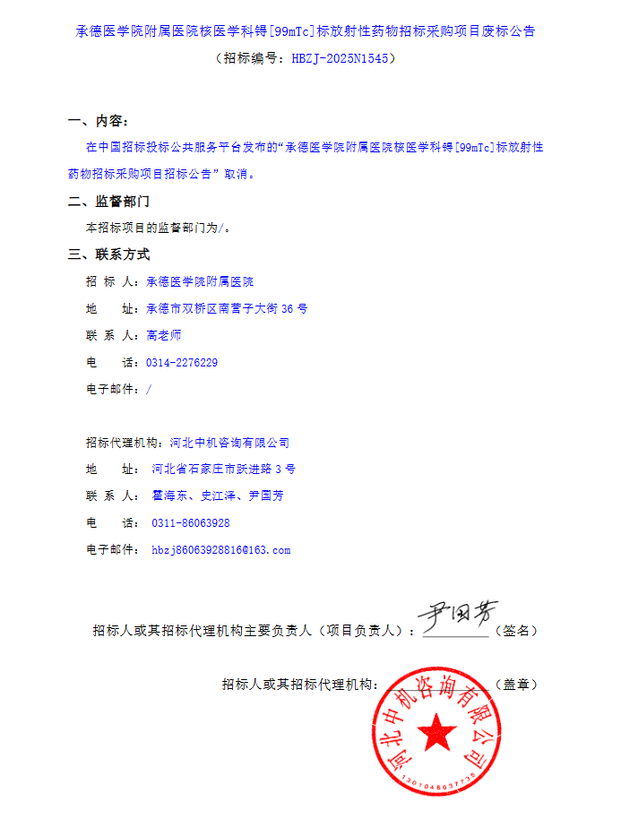 【承德医学院附属医院】河北省承德医学院附属医院核医学科锝〔99mTc〕标放射性药物招标采购项目废标公告