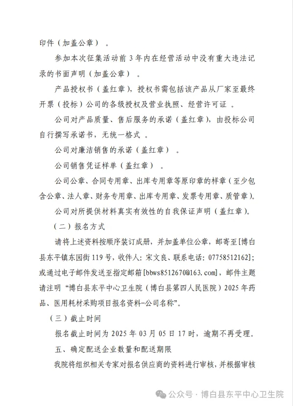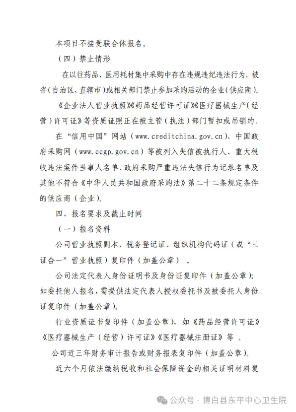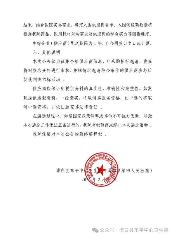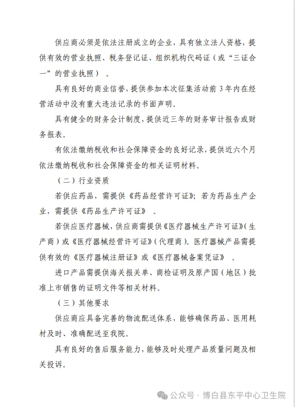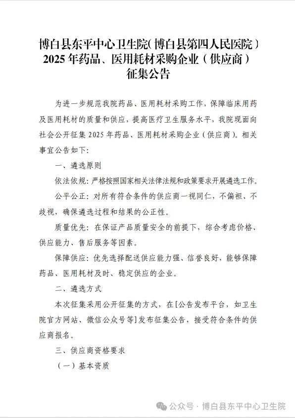 【玉林市博白县东平中心卫生院】广西壮族自治区玉林市博白县东平中心卫生院(博白县第四人民医院)2025年药品、医用耗材采购企业(供应商)征集公告