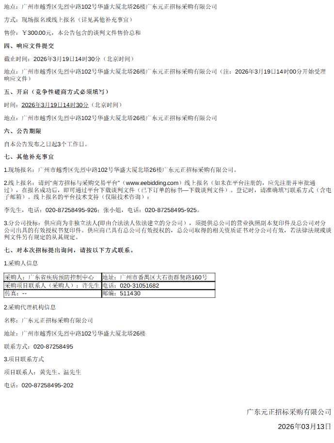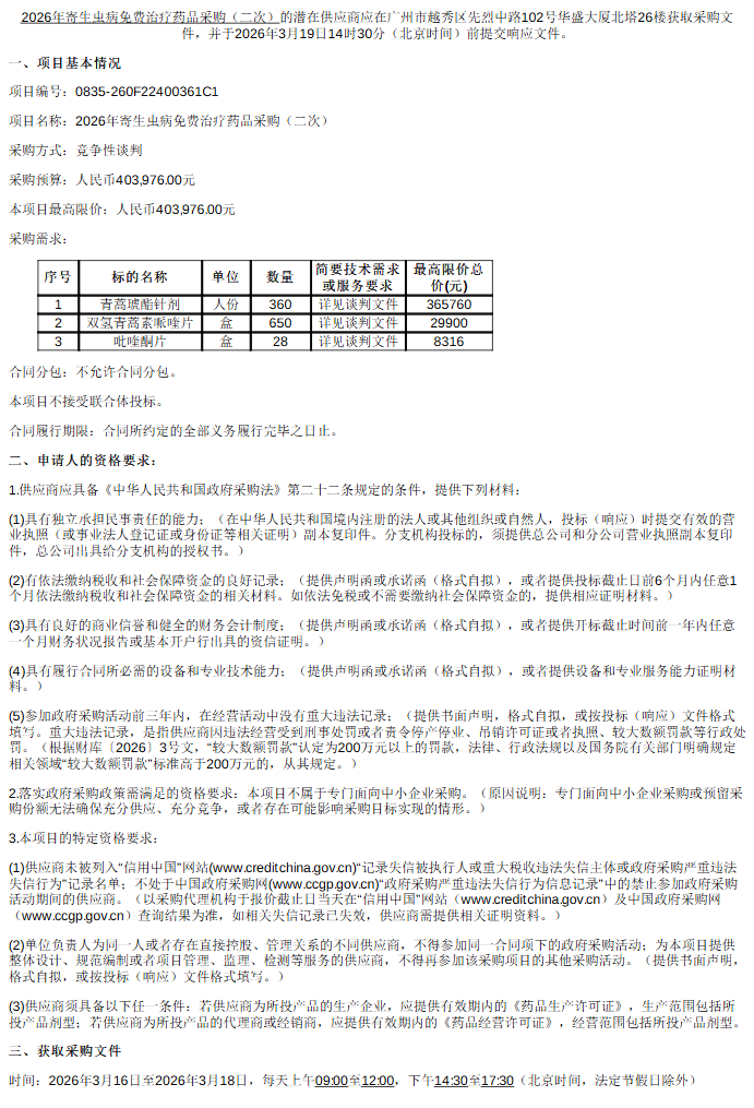 【广东省疾病预防控制中心】广东省疾病预防控制中心2026年寄生虫病免费治疗药品采购(二次)竞争性谈判公告