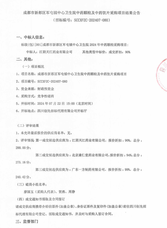 【成都市新都区军屯镇中心卫生院】四川省成都市新都区军屯镇中心卫生院中药颗粒及中药饮片采购项目结果公告
