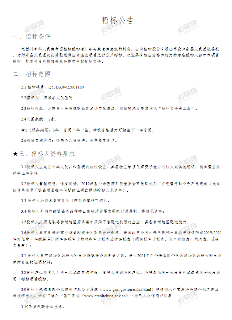 【师宗县人民医院】师宗县人民医院药品配送供应商遴选招标公告