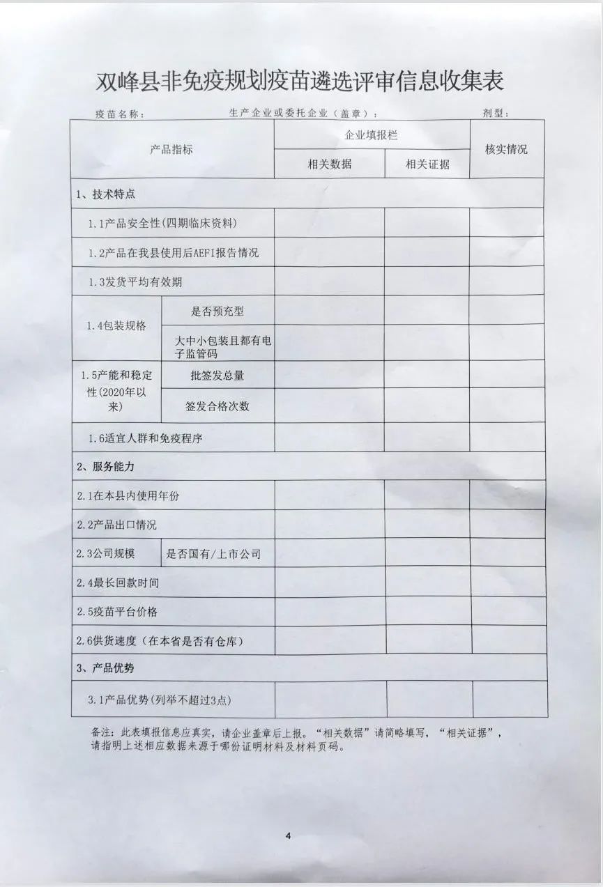 为进一步规范我县非免疫规划疫苗的采购和供应工作,确保我县非免疫规划疫苗使用科学规范、预防接种安全有效。秉着"公平、公正、公开"原则,我中心拟定于2023年4月底(具体日期另行通知)开展非免疫规划疫苗遴选工作,请有意参与的供应厂商,按遴选方案要求提供相关详细资料(见附件),于2023年4月24日前递交双峰县疾控中心免疫规划科,逾期未上交资料者,视为弃权。联系电话0738-6820701。