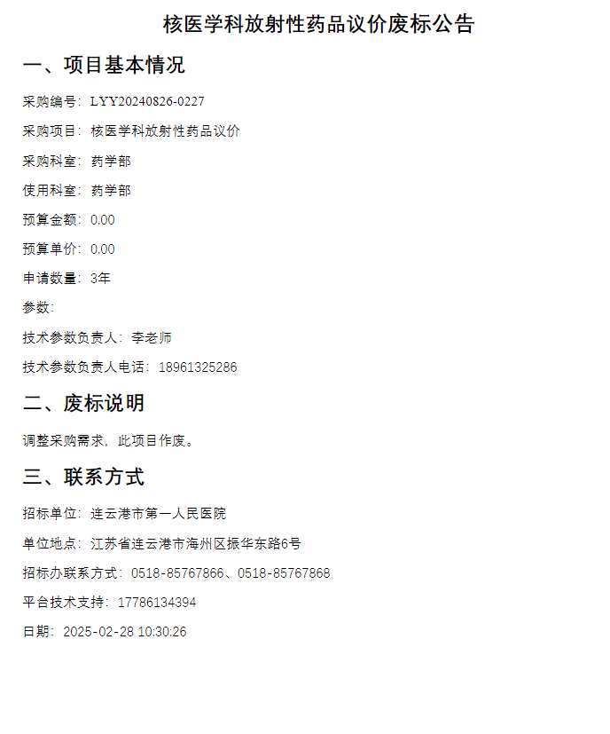 【连云港市第一人民医院】江苏省连云港市第一人民医院核医学科放射性药品议价废标公告