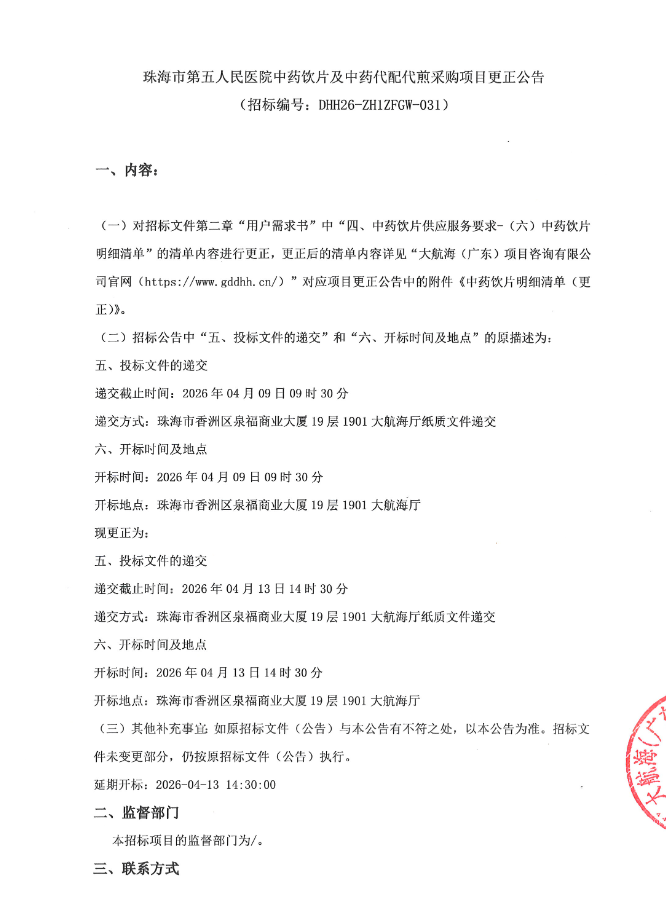 【珠海市第五人民医院】广东省珠海市第五人民医院中药饮片及中药代配代煎采购项目更正公告