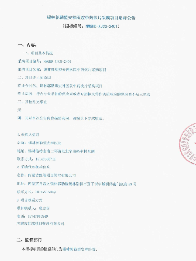 【锡林郭勒盟安神医院】内蒙古自治区锡林郭勒盟安神医院中药饮片采购项目废标公告