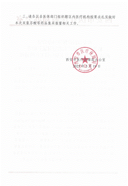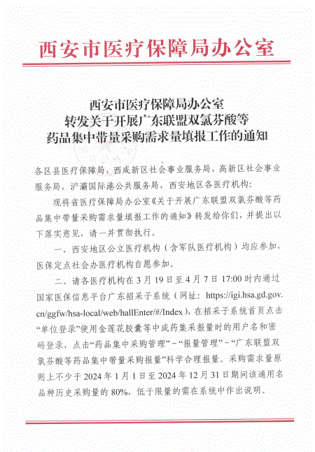 【西安】陕西省西安市医疗保障局办公室转发关于开展广东联盟双氯芬酸等药品集中带量采购需求量填报工作的通知