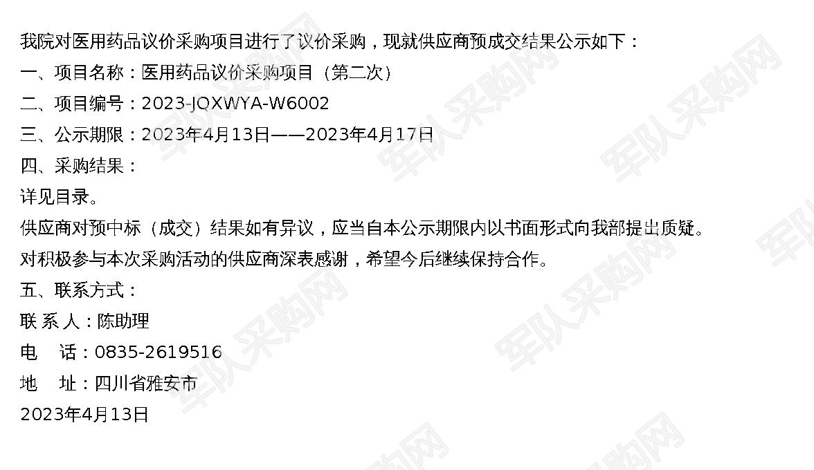 【军队采购】军队采购网医用药品议价采购项目(第二次)成交公告(2023-JQXWYA-W6002)