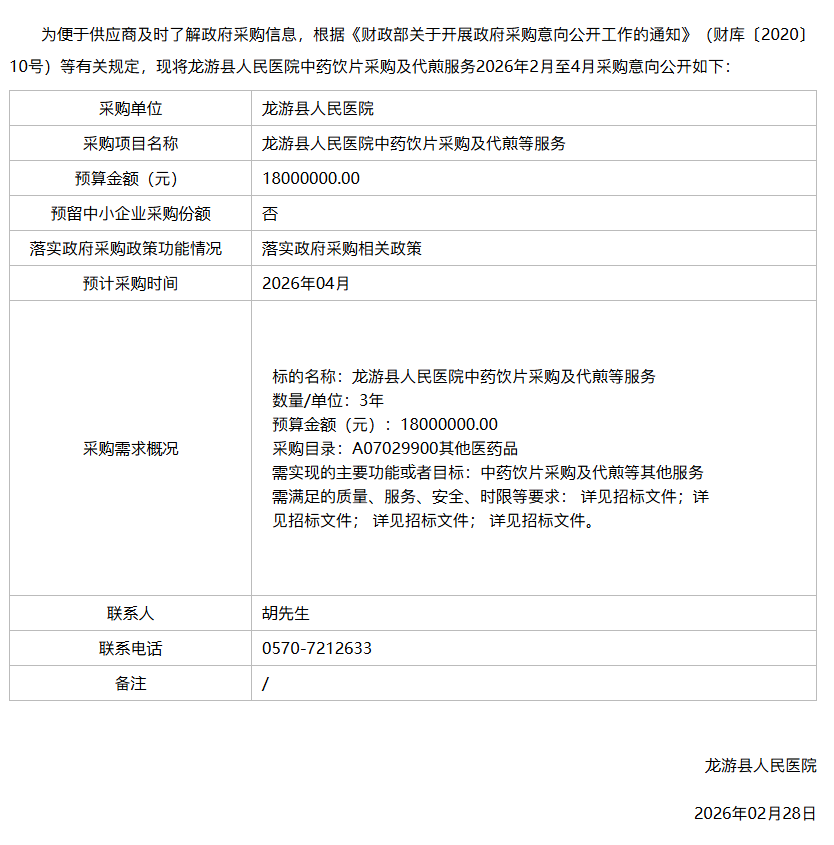 【衢州市龙游县人民医院】浙江省衢州市龙游县人民医院中药饮片采购及代煎服务2026年2月至4月政府采购意向