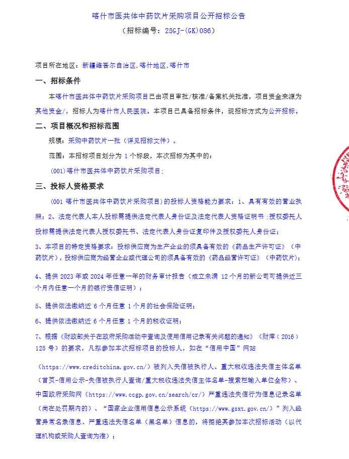 【喀什市人民医院】新疆维吾尔自治区喀什市医共体中药饮片采购项目公开招标公告