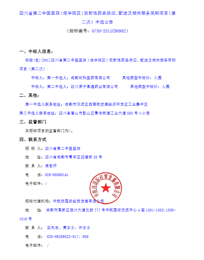 【四川省第二中医医院】四川省第二中医医院(成华院区)放射性药品供应、配送及相关服务采购项目(第二次)中选公告