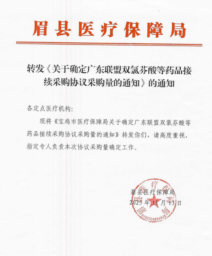 【宝鸡】转发宝鸡市医保局关于确定广东联盟双氯芬酸等药品接续采购协议采购量的通知