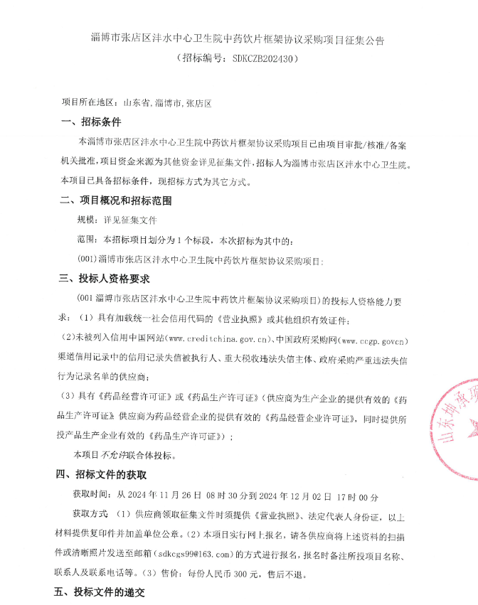 【淄博市张店区沣水中心卫生院】山东省淄博市张店区沣水中心卫生院中药饮片框架协议采购项目征集公告