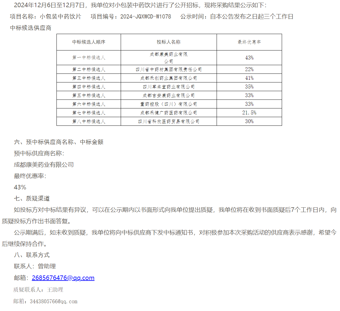 【军队采购】军队采购网小包装中药饮片采购结果公示(2024-JQXWCD-W1078)(第1包)
