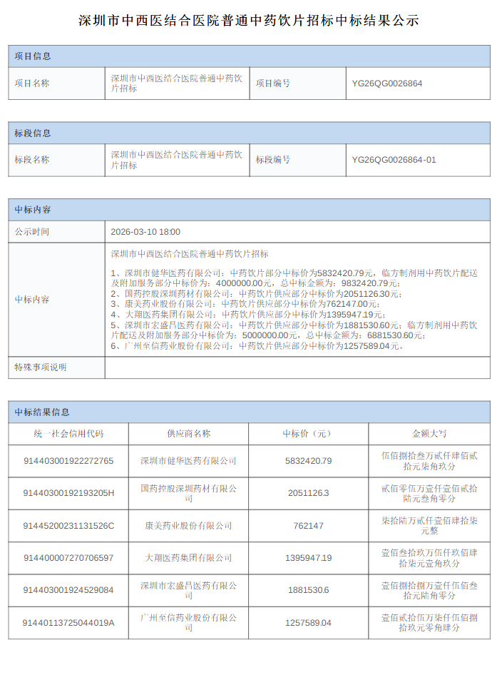 【深圳市中西医结合医院】广东省深圳市中西医结合医院普通中药饮片招标中标结果公示