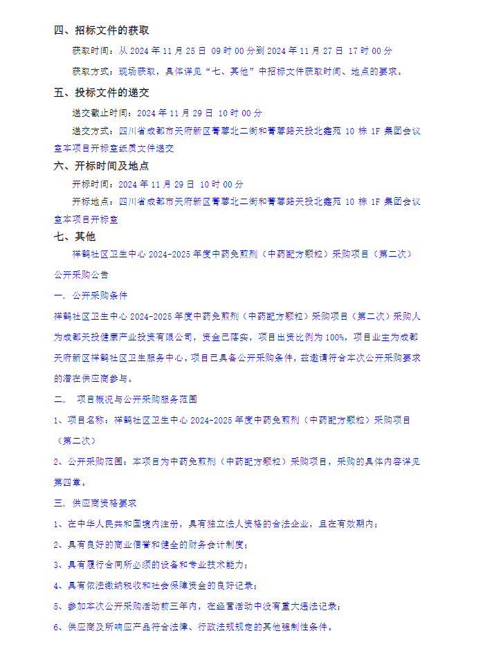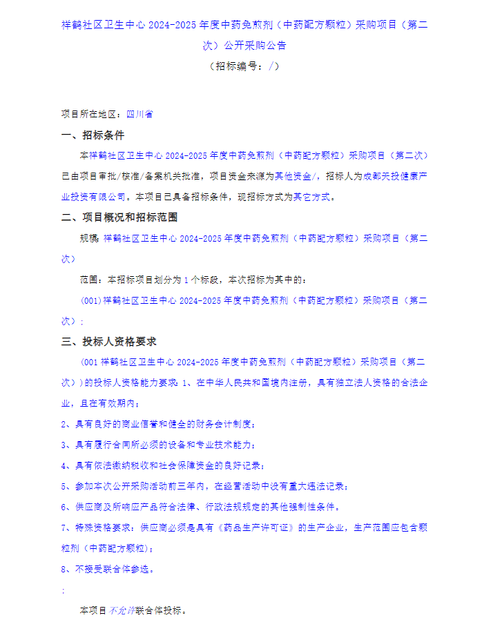 【成都市祥鹤社区卫生中心】四川省成都市祥鹤社区卫生中心2024-2025年度中药免煎剂(中药配方颗粒)采购项目(第二次)公开采购公告