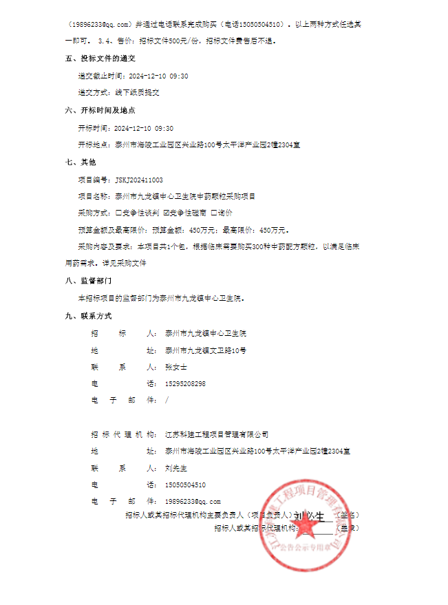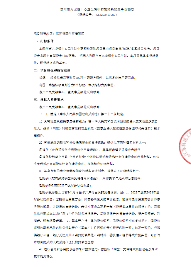 【泰州市九龙镇中心卫生院】江苏省泰州市九龙镇中心卫生院中药颗粒采购竞争性磋商