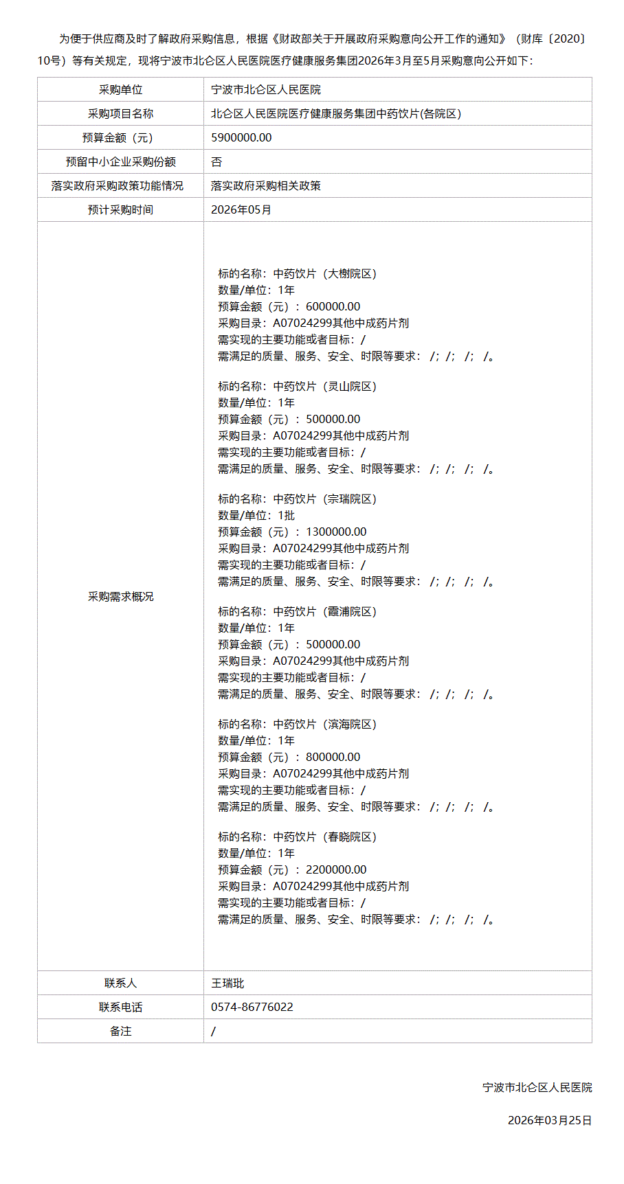 【宁波市北仑区人民医院】浙江省宁波市北仑区人民医院医疗健康服务集团2026年3月至5月政府采购意向