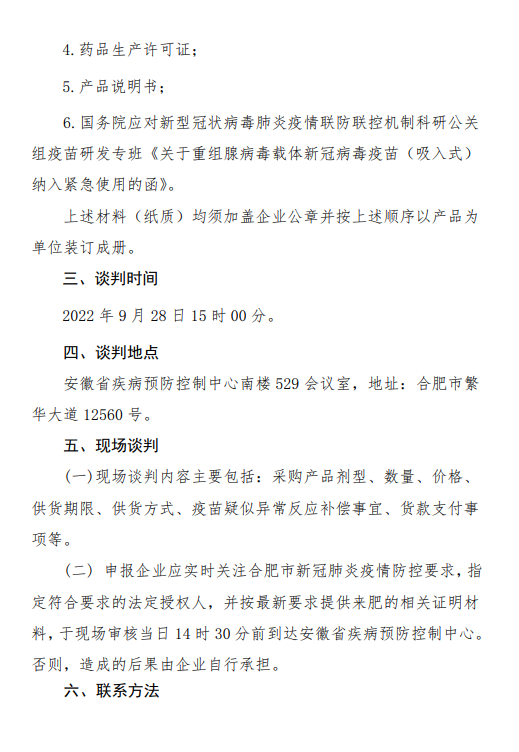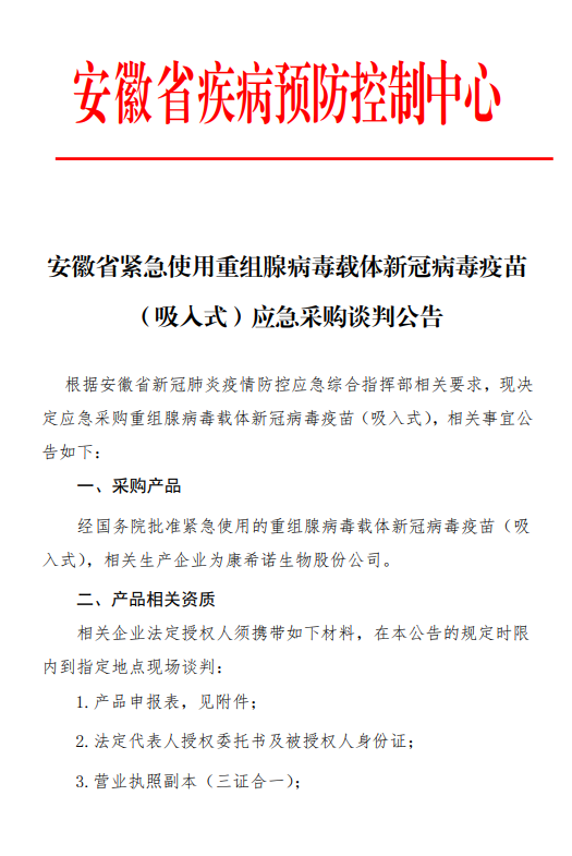 【安徽】安徽省医药集中采购平台〔转〕安徽省紧急使用重组腺病毒载体新冠病毒疫苗(吸入式)应急采购谈判公告