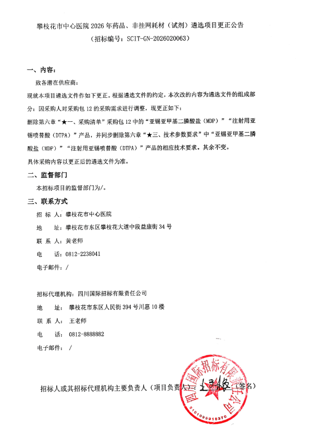 【攀枝花市中心医院】四川省攀枝花市中心医院2026年药品、非挂网耗材(试剂)遴选项目更正公告