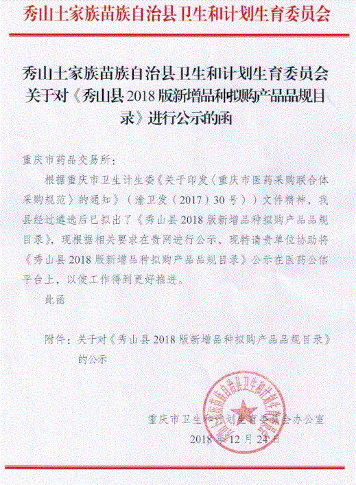 【重庆】2018年重庆市秀山县卫计委关于对《秀山县2018版新增品种拟购产品品规目录》的公示