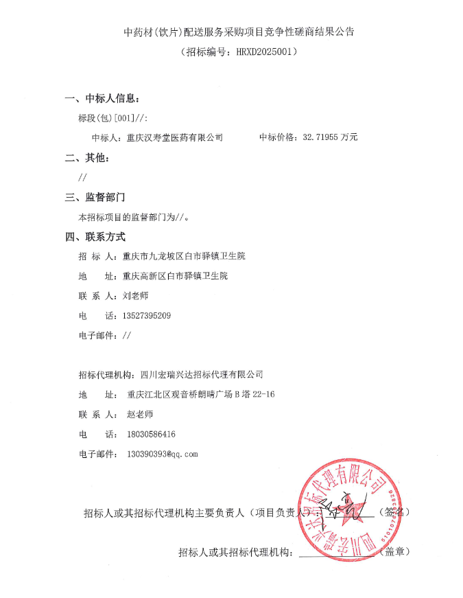 【重庆市九龙坡区白市驿镇卫生院】重庆市九龙坡区白市驿镇卫生院中药材(饮片)配送服务采购项目竞争性磋商结果公告