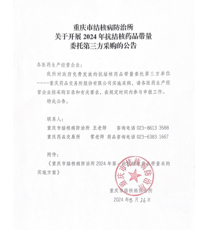 【重庆】重庆市结核病防治所关于开展2024年抗结核药品带量委托第三方采购的公告