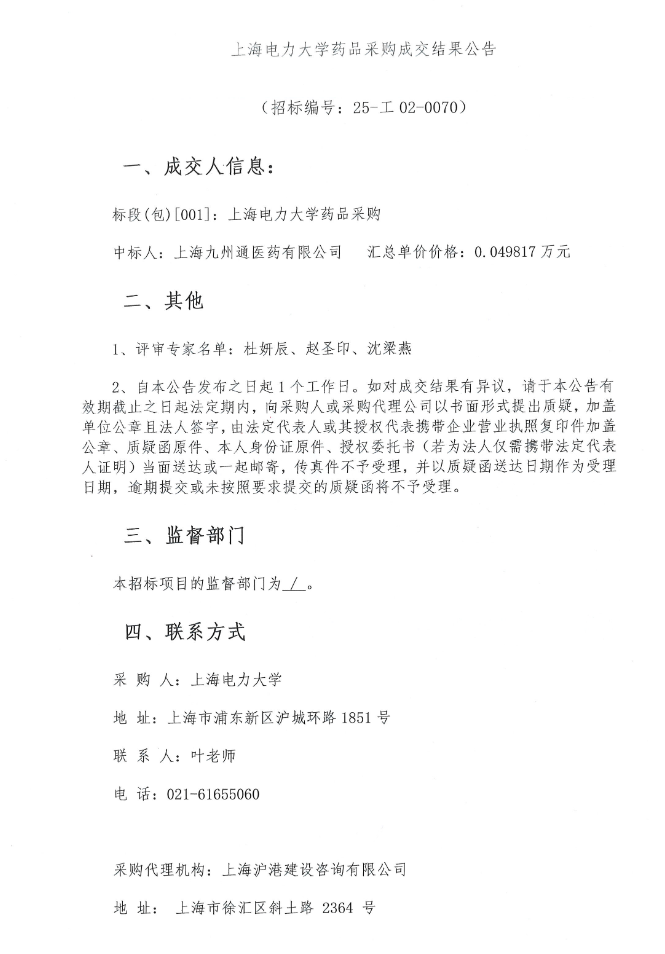 【上海电力大学】上海电力大学药品采购-成交结果公告