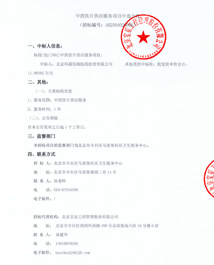【北京市丰台区马家堡社区卫生服务中心】北京市丰台区马家堡社区卫生服务中心中药饮片供应服务项目中选公告